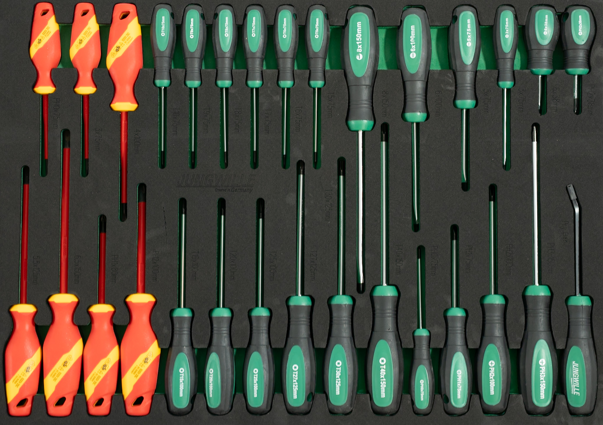 - 9 Lades met schuimrubberen inzetstukken: Iedere lade is voorzien van duurzame schuimrubberen inzetstukken die ervoor zorgen dat het gereedschap veilig en geordend blijft liggen. Dit helpt niet alleen om gereedschap snel terug te vinden, maar beschermt het ook tegen beschadigingen tijdens verplaatsingen.